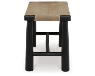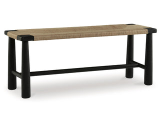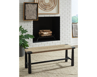 Accent bench. Upholstered in hand woven jute. Solid wood frame and tapered, post legs in matte black finish.