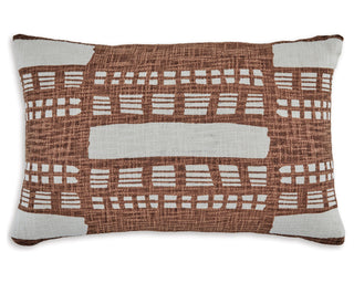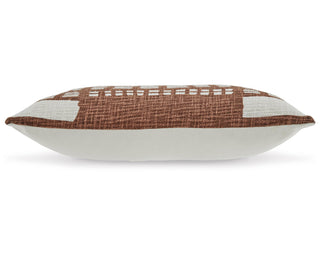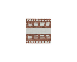 Woven slub with printed abstract stripe design in rust and white. Solid reverse in white. Knife edge construction. Cotton face with polyester reverse. Zipper closure. Fiber filled. Spot clean only.