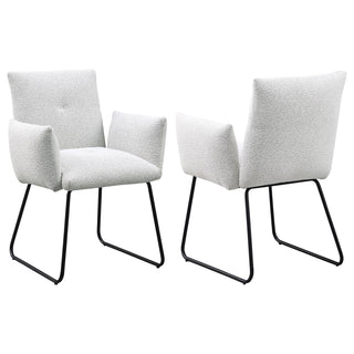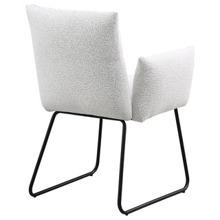 Elevate your dining experience with this modern dining chair, designed for both comfort and style. Upholstered in soft fabric, this chair provides a cozy seat for everyday dining or special gatherings. The chair features a contemporary design with gently curved armrests and a sleek, powder-coated black metal sled base for a minimalist yet bold look. Its clean lines and subtle elegance make it a perfect addition to any modern dining room or kitchen space.
