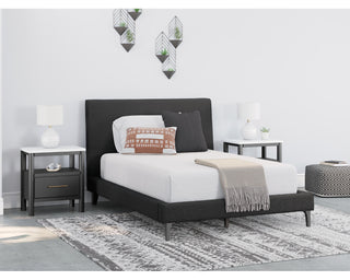 Matte black finish with subtle replicated wood grain accented with a replicated white marble top. Beds and cases feature round post leg details. Cases accented with light bronze colored finished handles. Side roller glides for smooth operating drawers. Drawer interiors are lined with a replicated linen design for a clean, finished look. Both USB and wireless charging options are provided with the nightstands. Nightstand (91) features ambient lighting under the top. Upholstered headboard options (57,58,87) feature a white textural fabric and wooden vertical posts. Headboards (57,58,87) attached to footboards (54,56,84) respectively. Footboards (54,56,84) require the use of B100-12, B100-13 or the B100-14 roll slats. Black upholstered bed full (72), queen (81), king (82) do not require additional foundation/box spring; accommodates most zero clearance adjustable bases. Safety is a top priority, clothing storage units are designed to meet the most current standard for stability, ASTM F 2057 (ASTM International). Drawers extend out to accommodate maximum access to drawer interior while maintaining safety. Minor assembly required.