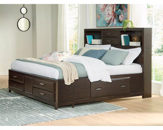 A rich, metropolitan finish. Unbeatable function. With this California king storage bed, it’s a breeze to create a casual contemporary hideaway full of style and convenience. It combines thoughtful craftsmanship and handy storage, with assorted drawers to help you maintain an organized and clutter-free space. Cubbies in the headboard keep bedtime reads close while also acting as the perfect perch for bedroom decor.