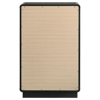 Create a dedicated space for clothing and accessory storage with this modern five-drawer chest. Its sophisticated presentation is complemented with a black finish over durable melamine surfaces, resisting damage to maintain its fresh, clean aesthetics. Each drawer front is dotted with a pair of ball knobs, offering seamless performance and a refined, glam touch of character. The chest features a rounded silhouette, softening the dark black finish, while adding to its modern appeal. Add art to its roomy top to create a truly eye-catching accent piece in your bedroom.
