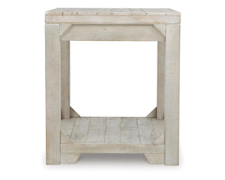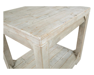 Take in the country fresh look of this end table and connect with a simpler time. Its farmhouse style is evident in its stocky design with planked top/bottom shelf, unique triangle accents and relaxed white washed finish. With a handcrafted look thanks to reclaimed wood, you'll love the casual feel this piece brings to your living area.