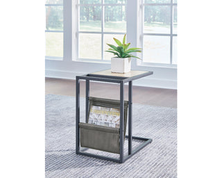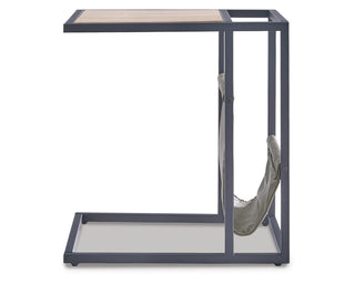 Casual contemporary design with a clean silhouette. That's the beauty of this chairside end table. Quality crafted with elm veneer, its tabletop is finished in a light natural wood tone that lends a fresh, organic look. Cool metal C-frame in a matte black finish and a hanging magazine basket made with a durable brown faux leather coordinate beautifully with the less-is-more profile.