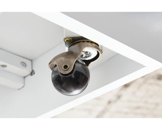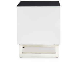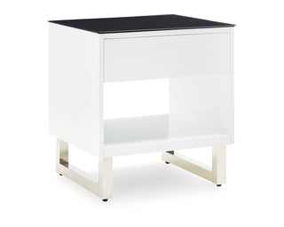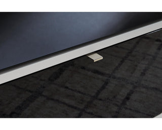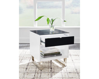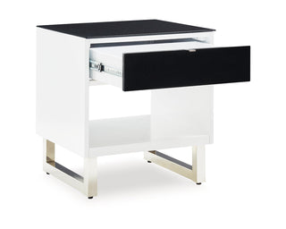 Modern Contemporary design. Made with MDF substrates finished in a clean high gloss white. Drawer fronts are made with a black acrylic laminate that combines nicely with the black glass tops for a stunning two-tone effect. The cocktail cabinet features 2 spacious drawers, a large open display shelf and casters for easy mobility. T756-3 end table has a single storage drawer with an open display shelf below. T756-7 chairside table with drawer incorporates a 110V power supply with USB-A / USB-C charging ports located in a small cubby space for keeping your devices charging close at hand.