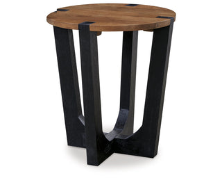 Natural Contemporary Design. Made with solid Mango wood. Two-tone finish scheme featuring a light brown top captured by solid wood legs finished in a warm black color. Tables have angled legs for a modern design that intersects with the top for added visual interest.