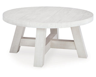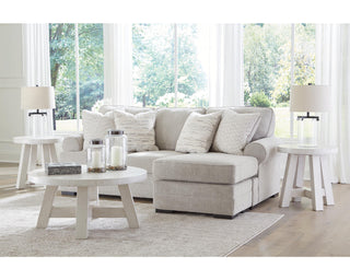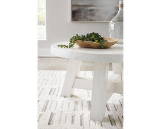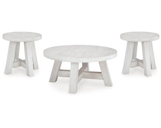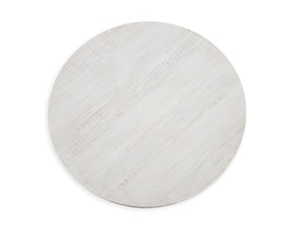 Carefully crafted with farmhouse appeal, this occasional table package features braced posts and thick round tabletops. An off-white finish adds depth and character to the simple silhouettes. You won't be able to resist the organic appeal of this versatile set.