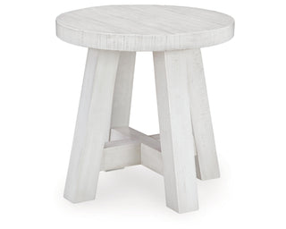 Carefully crafted with farmhouse appeal, this end table features braced posts and a thick round tabletop. The off-white finish adds depth and character to its simple silhouette. You won't be able to resist the organic appeal of this versatile piece.