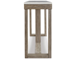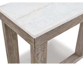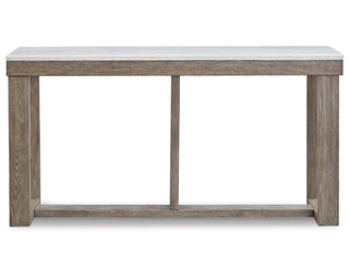This sofa table is simple in design but big on style. Finished with a trend-right grayish brown wood tone, its bold, blocky profile and natural marble top are timeless classic choices that is ideal for pairing with an ottoman underneath to pull extra seating into the room or remaining clean and sleek on its own. Adding to its beauty, the marble top's color variations, fissures, mineral deposits and veining are naturally formed and are not defects.