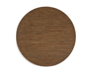 Casual Rustic design. Made with thick distressed Pine solids. Finished in a warm brown wood tone with rubbed glaze to enhance the distressed wood textures. Craftsmen inspired post and beam base design. Thick round tops.