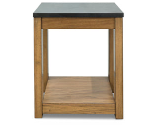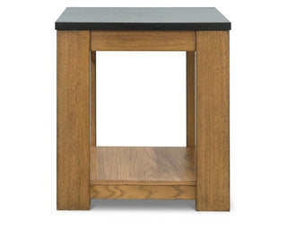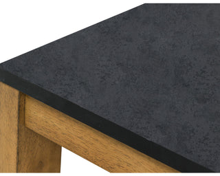 This rectangular end table simplifies any occasion in fine style. Clean lines and natural wood-tone legs make it endlessly versatile. The table's faux stone MEGA-TUFF® melamine laminate top is durable and waterproof—a clever blend of form and function.