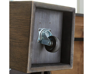 Casual contemporary styling. Made with solid wood components, Oak veneer and MDF substrate. Finished in a richly glazed brown wood tone. Table designs feature architectural geometry with bold chunky silhouettes. The cocktail table features a lift top for additional work or dining surface and casters for easy mobility. The end table includes a wireless charger conveniently located in the top.