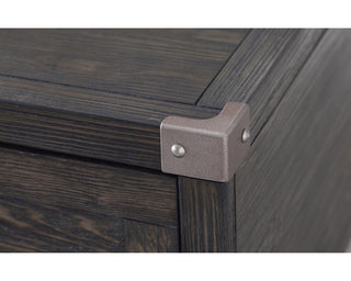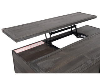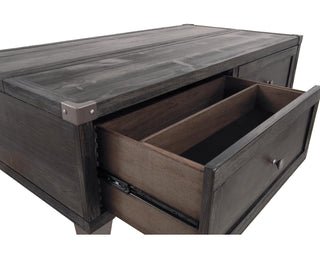 Made with Pine solids and veneers and finished in a dark grayish brown weather washed color with wire brushing texture. Tables have contrast metal corner accents and angled metal legs. Cocktail table features a half lift top surface, fully finished drawers with removable storage trays. T901-3 end tables have drawer storage and a rear mounted AC power supply with (2) USB charging ports.