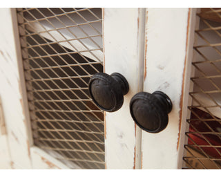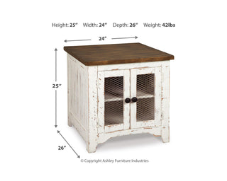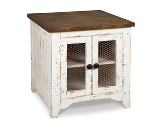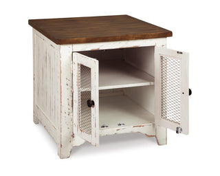 Double take. Sporting a two-tone finish that pairs a distressed vintage white with aged natural pine color, this end table elevates the art of rustic farmhouse living. Enhancing its charm: shelved storage visible through cabinet doors with inset metal grills.