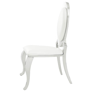 This dining chair blends classic form with modern materials for a bold statement. An oval backrest and gently flared silhouette evoke traditional influence, while the stainless steel frame and Queen Anne cabriole legs add a sculptural presence. Upholstered in smooth white faux leather, the cushioned seat and back provide comfort with easy care. The polished chrome finish completes the look with reflective shine and visual contrast.