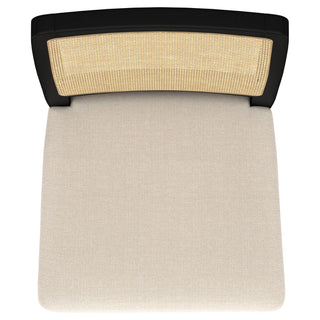 This dining chair combines modern comfort with organic charm, featuring a handwoven cane backrest crafted in Indonesia for a natural, textured appeal. The solid Asian hardwood frame provides durability and a warm aesthetic, while a beige linen-like upholstered cushion enhances its cozy style. Pirelli webbed seat construction ensures both comfort and lasting support. Reinforced with a sleek metal stretcher bar, this chair balances beauty and functionality.