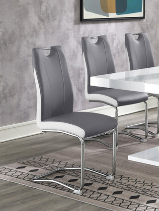 Sleek and stylish, this side chair features a modern cantilever design with a two-tone faux leather finish. Upholstered in soft grey with crisp white accents, the chair showcases a sculpted silhouette highlighted by tailored welt trim. A polished chrome base adds contemporary shine and retro flair, while the integrated handle offers easy movement. Perfect for elevating any modern dining space.