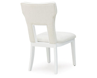 Embracing modern glamour, this dining chair is a dazzling addition to your dining area. A bright white lacquer finish and a contemporary cutout design give it a look all its own. The sumptuous upholstery wows with metallic thread accents.
