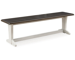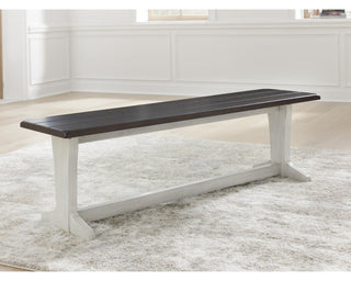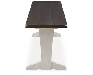 Make a farmhouse-inspired statement with this dining bench. It's beautifully crafted with a clean, classic two-tone finish and a thick planked effect. Making room for the whole family, this bench sports a casually comfortable vibe.