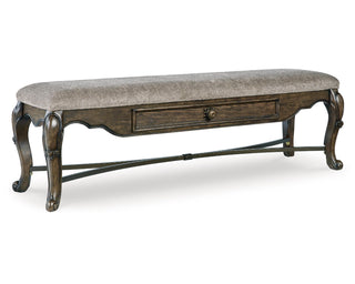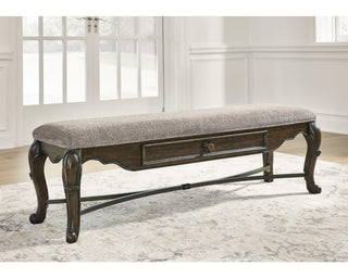 From its ornamental appliques to its large scale, this dining bench makes a bold statement. With ornately shaped legs, a plush cushioned seat and a storage drawer, the opulent bench wows with stunning style. The look is timeless. The feel? Right at home.