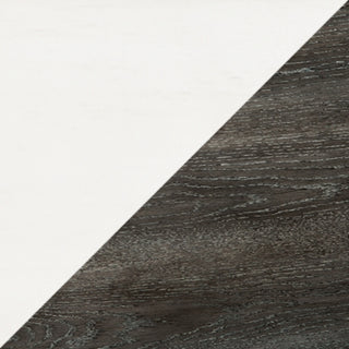 Timeless traditional design with a casual vibe. Small round dining table made with solid wood, cast resin, white oak veneer and engineered wood. Painted white finish with a dark brown oak top and seats with weathered gray wood grain texture. Solid wood chair frames and seats. Matching two-tone finish. Inset metal nail head accents on chair rail for detail.