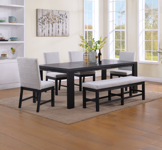 Introducing a minimalist dining ensemble with a touch of modern flair. The deep-toned wood finish of the table complements the structured lines, while the lightly cushioned chairs and bench provide both style and comfort. Crafted for durability, the reinforced legs and sleek design make it suitable for contemporary households seeking functionality with a subtle elegance.