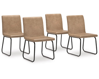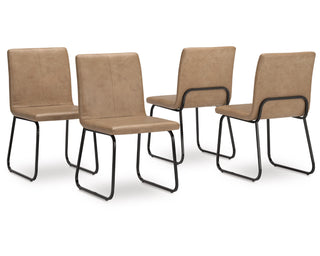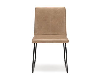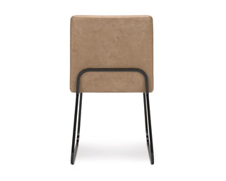 Casual contemporary design with a modern vibe. Made with tubular steel frames with a durable powder coat finish in a dark gunmetal color. The stylish metal framed dining chair features a modish design with a fully cushioned seat and back rest in a tan faux leather.