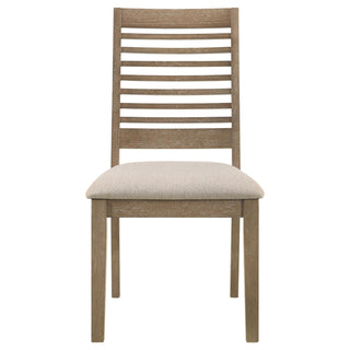 Introduce farmhouse charm to your kitchen or dining room with a set of two side chairs. Perfect for family dining, the chair feature Asian hardwood construction with a simple silhouette and wire brushing for added texture and depth. Seats are padded with foam for excellent comfort, while latte upholstery is neutral and versatile. Ladderbacks feature slim slats, completing a stylish look with a dose of visual texture. This set is ideal for a welcoming dining table in your home.