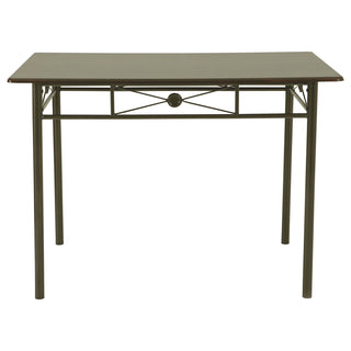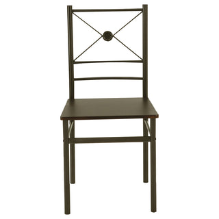 This stunning five-piece dinette set is as fashionable as it is functional. With seating for up to four, it's perfect for an eat-in kitchen or breakfast nook. Its beautiful dark bronze finish is enhanced by an eye-catching crisscross design and artistic circular accents. A vinyl-topped table and seats allow for easy cleaning, while a base of metal tubing provides strength and durability. This lovely dining set is ideal for grabbing a quick bite before heading to work, or for sitting down to enjoy a leisurely meal with the whole family.