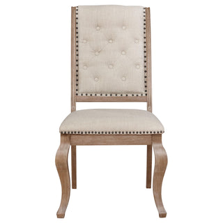 Terrifically transitional with subtle glam details comes this wood and upholstered dining set. Including a 20” removable extension leaf, this beautiful wood dining table is finished in a natural wood color with distressed wood grain accents. The dual pedestal base offers a final touch of traditional appeal. Find gorgeous coordinating dining chairs, upholstered in cream fabric. The dining chairs are adorned with individually applied nailhead trim with cabriole style legs for a finishing touch.