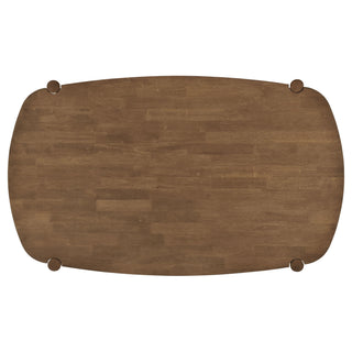 Introduce a sense of calm, casual ambiance in a dining set that speaks to the love of classic style. This seven-piece dining set is suited to both contemporary and transitional spaces, bridging motifs creating carefree aesthetics. Walnut finish Asian hardwood construction is sturdy without adding an overly chunky look, maintaining the clean lines you like to see. This set features a rectangular table with a straight edge top and rounded corners, while tapered legs are flush mounted as exterior side accents. Retro influence creates six chairs with curved backrests and nicely padded seat cushions upholstered with soft brown fabric.