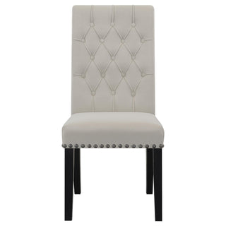 This elegant, contemporary, five-piece dining set completes formal dining experiences with a round, white, cultured marble, and rustic espresso pedestal table and four upholstered parson style side chairs. Charming details like button-tufted rolled backrests, bold nailhead trim, and flared legs lend a classical approach with modern elements.