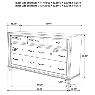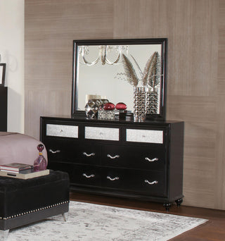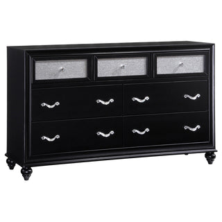 Glitzy and glamorous, this stunning dresser will instantly amplify your decor. With three smaller drawers at the top and four large drawers underneath, it easily organizes your wardrobe. Its bold, black frame is brought to life by glittery, metallic drawer fronts. Faceted crystal hardware adds even more shimmering shine. This magnificent dresser is perfect for any bedroom that could use a touch of sparkle.