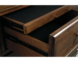 A fresh, new take on traditional style. This dresser meets today’s design tastes with beauty and grace. Its tobacco brown finish allows the natural grain of the acacia veneers to show through in an organic way. Aged brass-tone knobs dress the fronts of the roomy drawers. A hidden pull-out tray behind the top middle drawer puts your small valuables out of sight. This is a look you can appreciate for years to come.