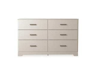 With its clean-lined look and modern attitude, this dresser is a fresh style awakening. A crisp, white hue over subtle replicated wood grain easily complements other furniture finishes. Smooth drawer fronts with antiqued pewter-tone handles complete the aesthetic.