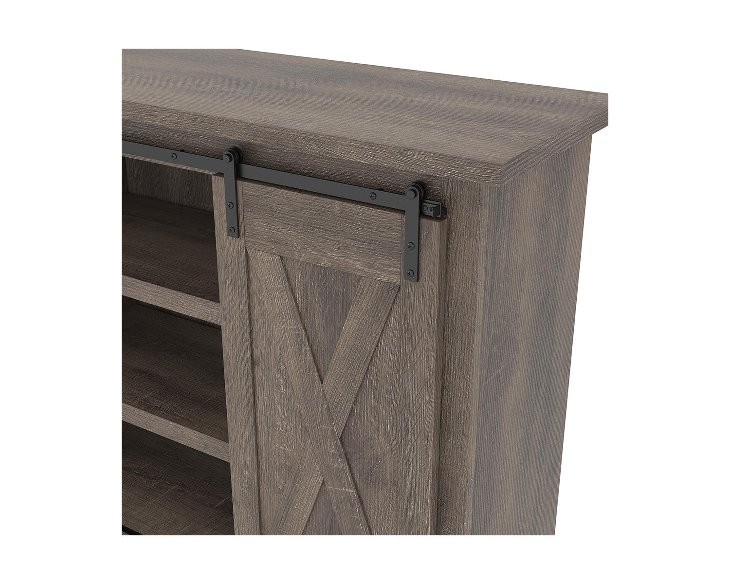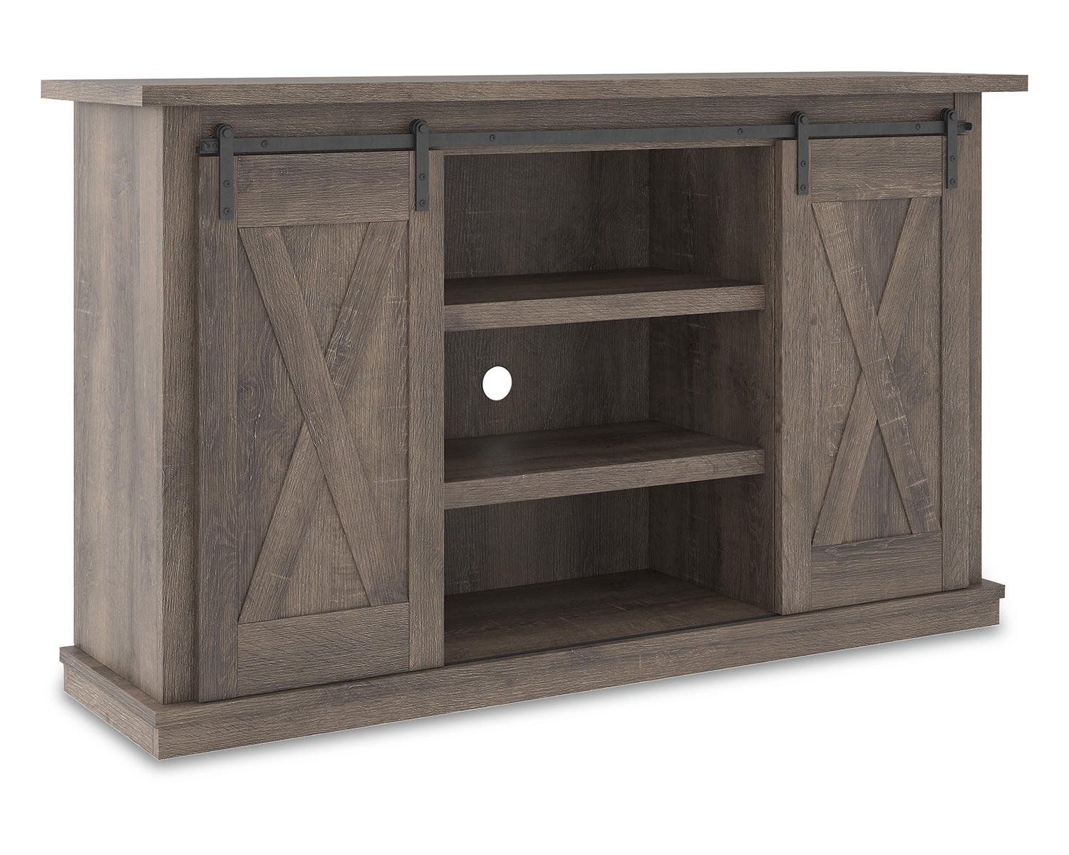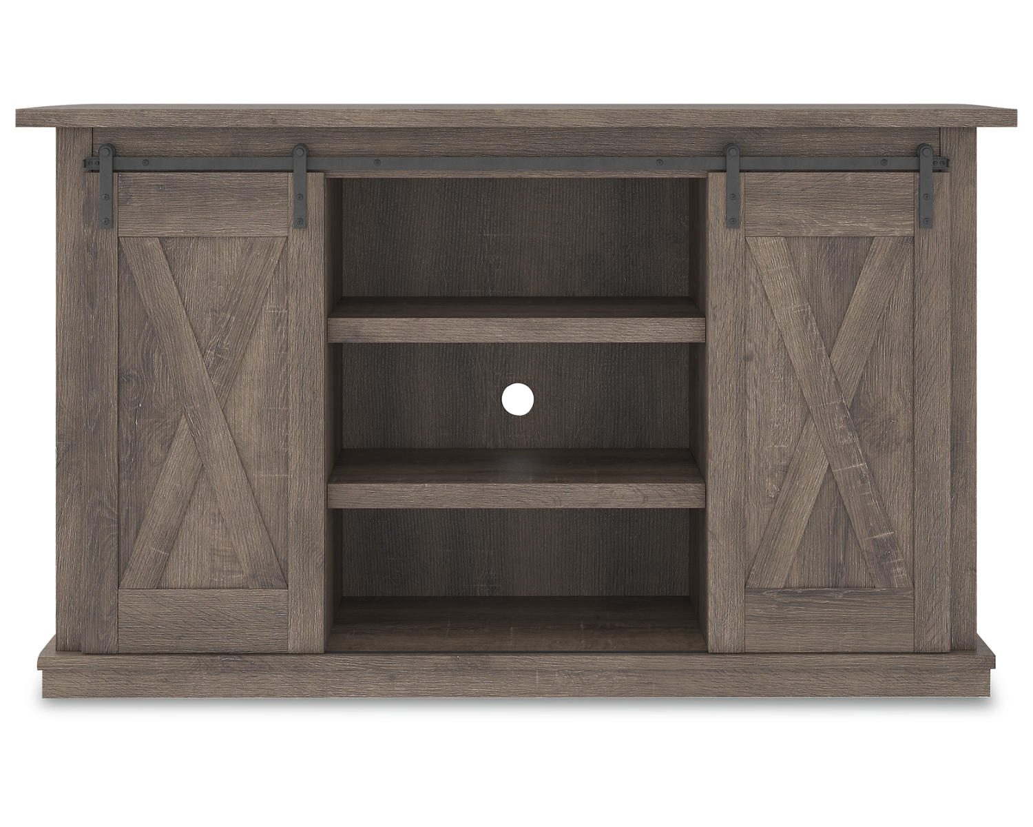 With its replicated weathered oak finish, crossbuck details and authentic charm, this TV stand is right in tune with your relaxed approach to high style. Beautifully made to accommodate your media equipment, it’s well equipped with adjustable shelving, cutouts for wire management and, of course, a pair of sliding barn doors you can center or place to the side. What a mastery in modern farmhouse living.