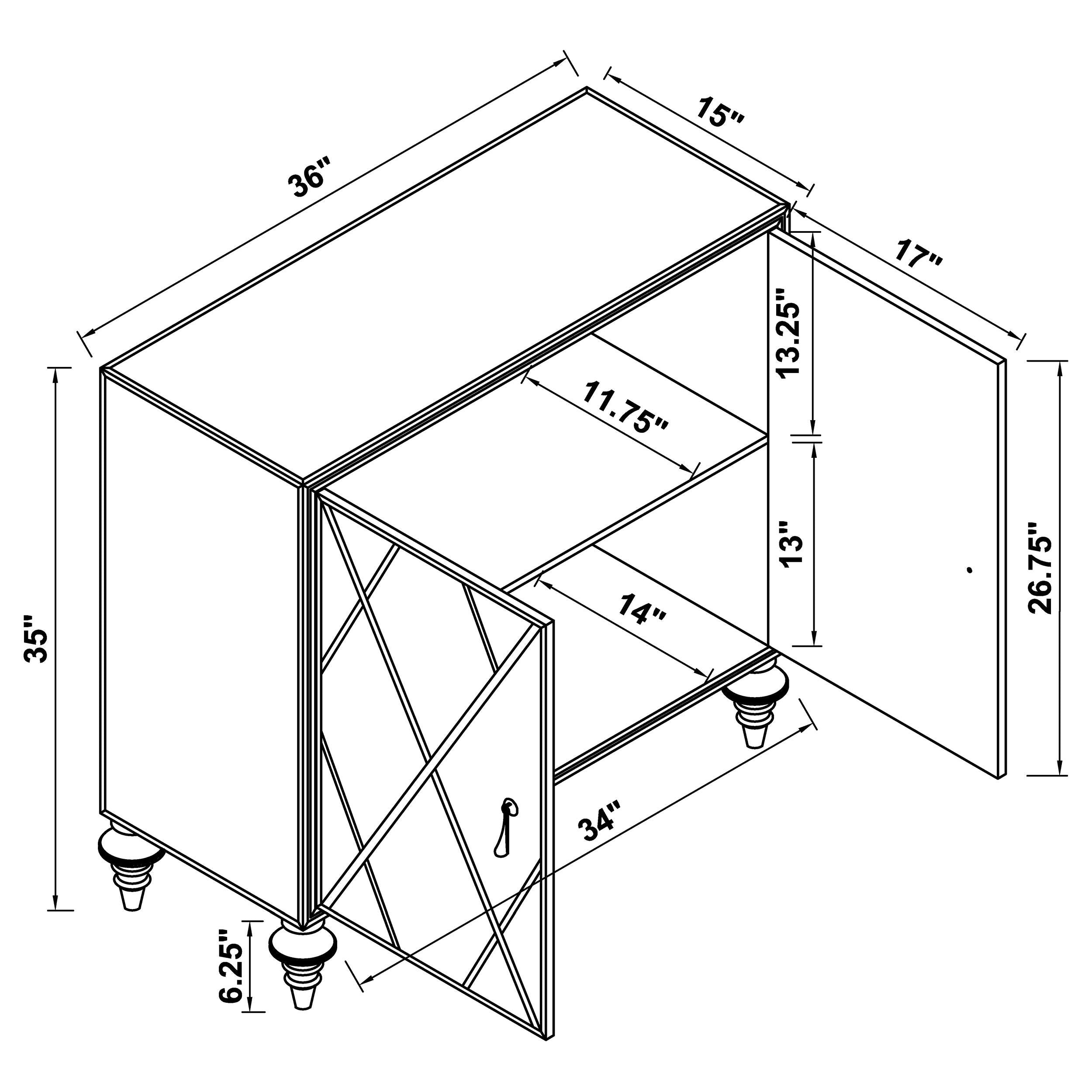 Polished materials and luxe accents combine to create this stunning, glam accent cabinet. Covered almost entirely in mirror surfaces, this accent cabinet boasts a latticed design in the dual cabinet doors, inset with a champagne diamond pattern. The shimmering champagne finish carries through in the borders, traditional teardrop pendant hardware and capped feet. Store personal effects inside, organized on the two shelves. Supported by elegantly turned acrylic legs that offer a transparent look, this accent chest exudes a regal, refined aesthetic.