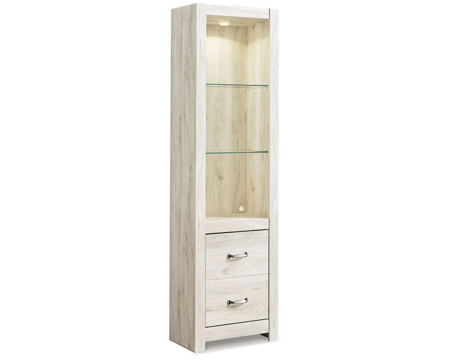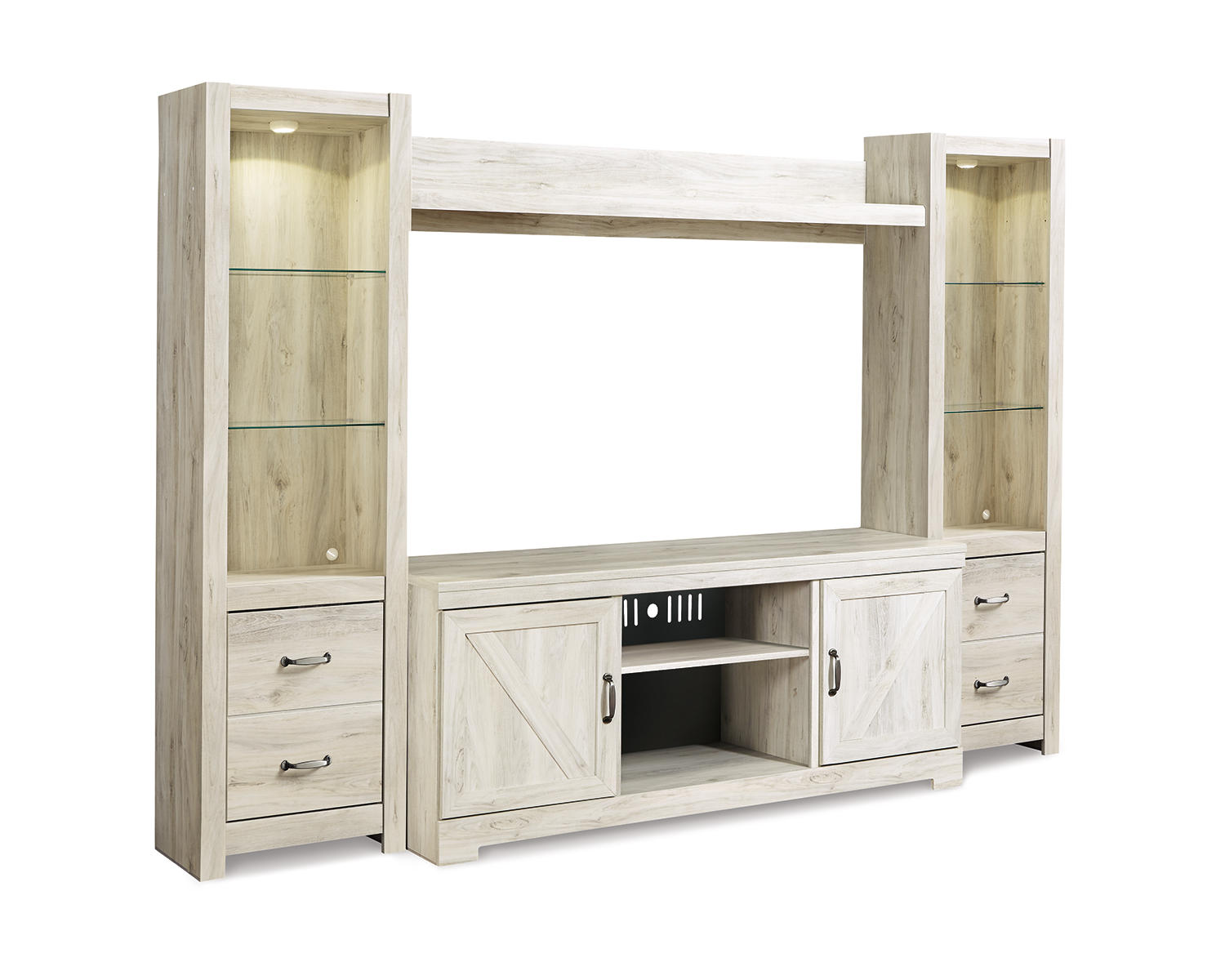 Wispy white finish over replicated Oak grain with authentic touch. Handles in a brushed nickel colored finish with black hang up. The W331-68 is compatible with the W100-02,101 LED fireplace insert. Entertainment piers feature open glass shelving for display with display light and doors for storage. Doors on the entertainment piers and TV stand have adjustable shelves. W331-24 has reversible doors and can open left or right with consumer assembly modification. TV stand features crossbuck details on the doors.