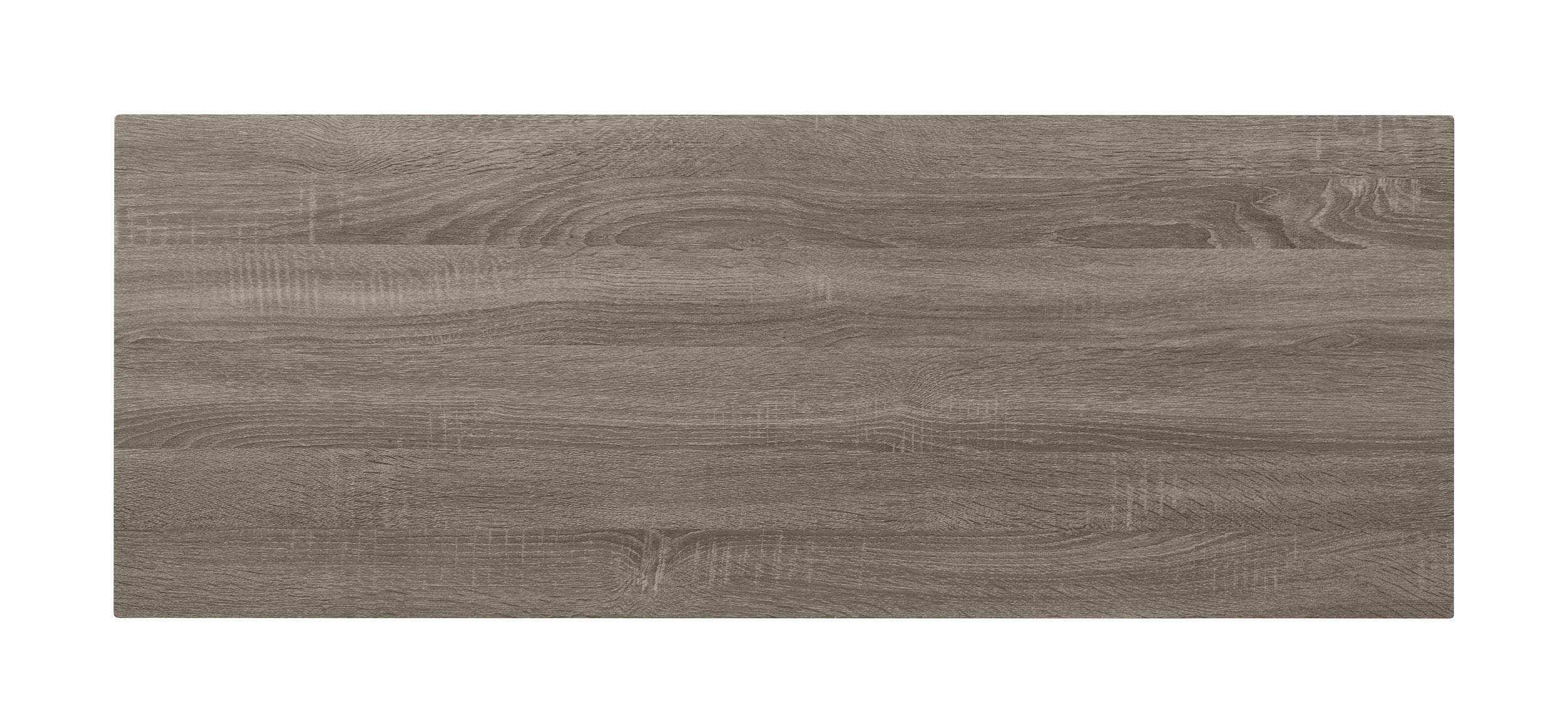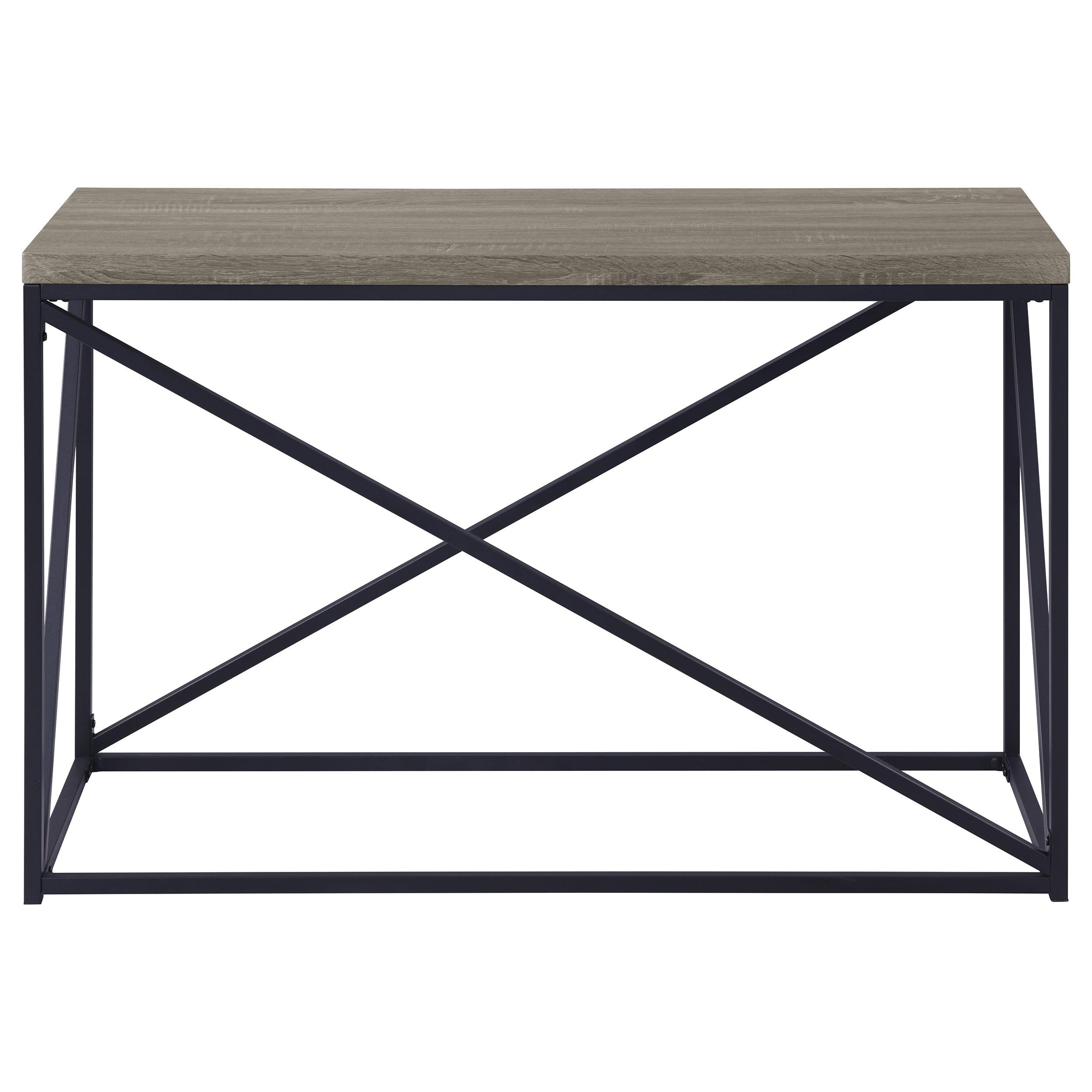 Enhance your living room with this sleek console table, combining industrial design with modern functionality. The engineered wood top in a sonoma grey finish offers a durable, scratch-resistant surface, highlighting a natural wood-like texture. A black powder-coated metal base with cross-brace detailing adds visual appeal and reliable stability. This versatile sofa table is perfect for organizing essentials or displaying decor in any contemporary or minimalist setting.