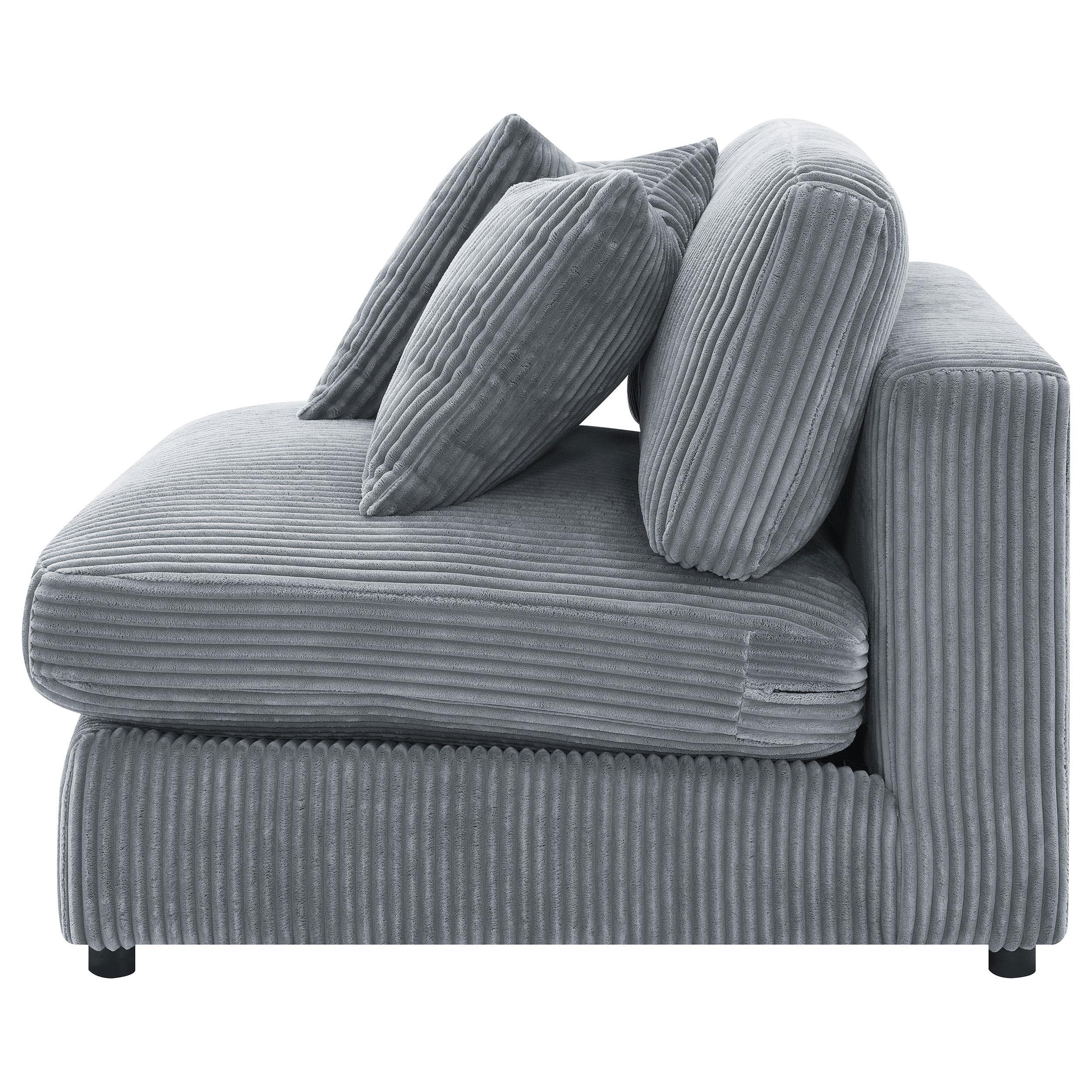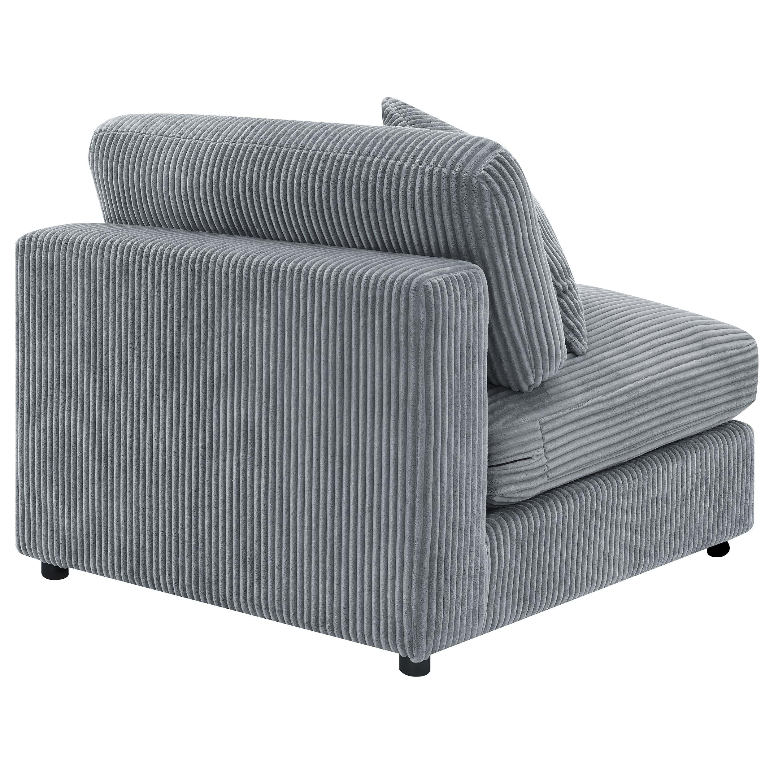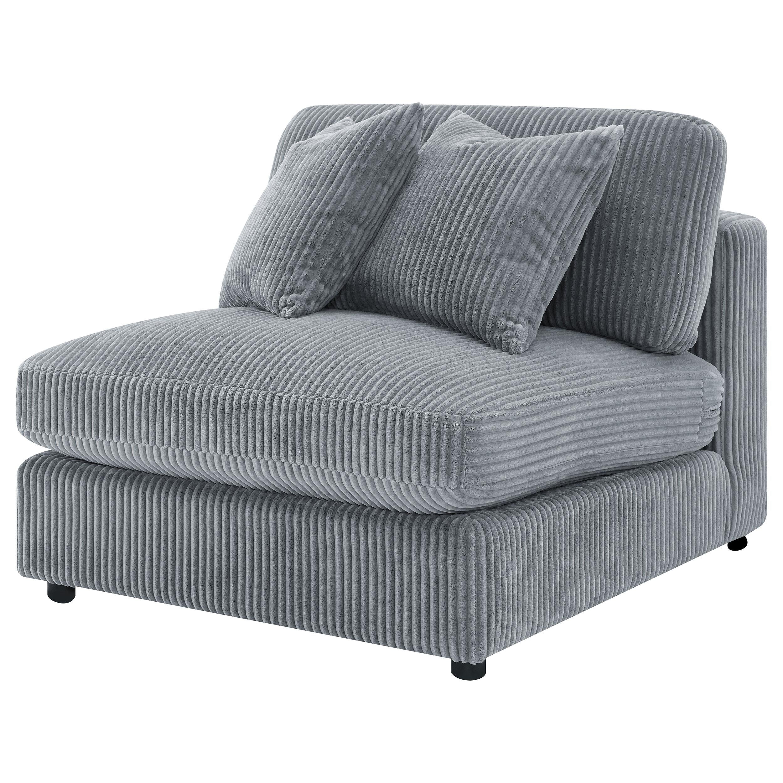 Instill cozy and inviting energy in your den or living room with a modern armless chair. Plush and comfortable, it features soft cushions and wide wale corduroy style upholstery in a soft neutral hue, perfect for augmenting existing seating. The seat and back cushions are each reversible, adding versatility and perfect for families and entertaining. Feet include non-skid grip to help keep the chair just where you place it within your space. Group couple by the fire, or add a cozy spot for reading and relaxing to your home office.