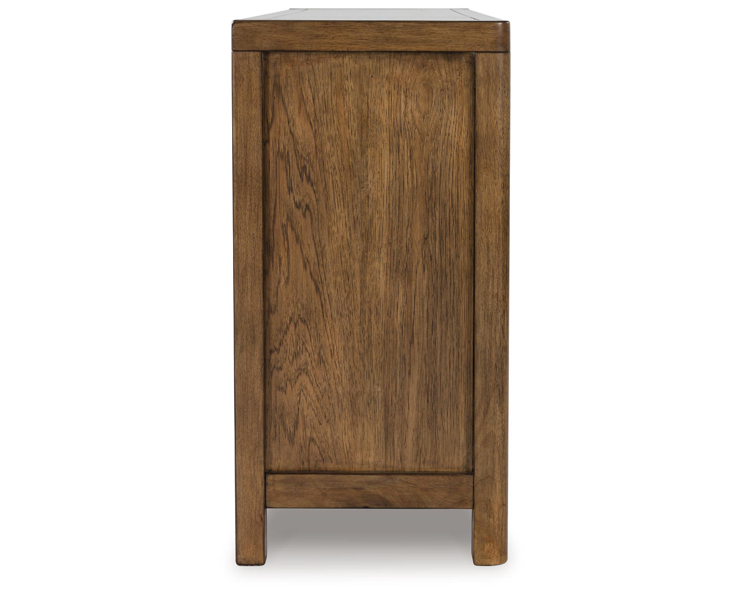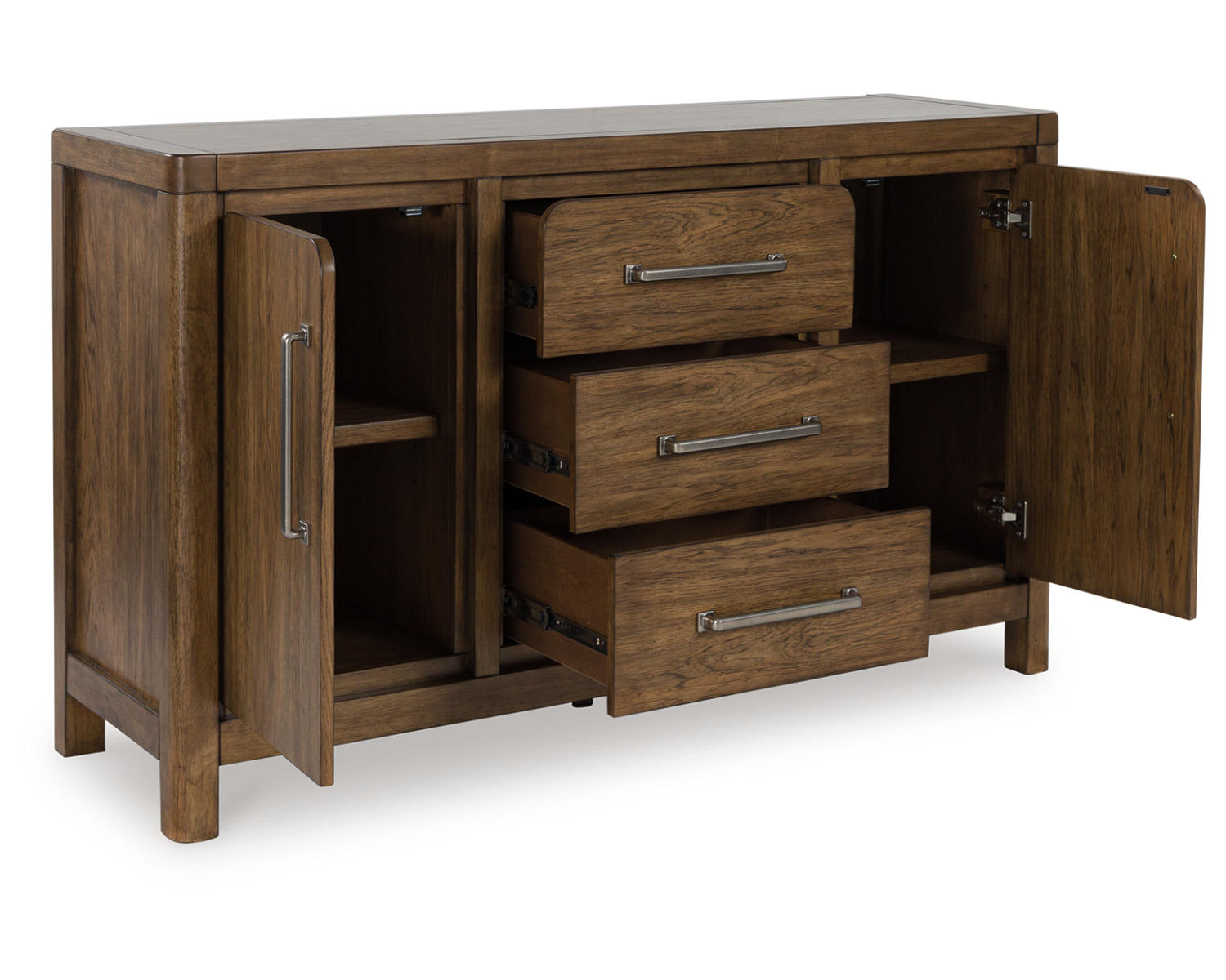 Define your dining room with reliable function and style. This dining server sits comfortably at the intersection of modern lodge and farmhouse aesthetics. Charming architectural elements and a light brown glazed finish reflect your warm and welcoming disposition. Even with its poise, it remains practical, serving up plenty of storage space in its dual cabinets and spacious drawers.