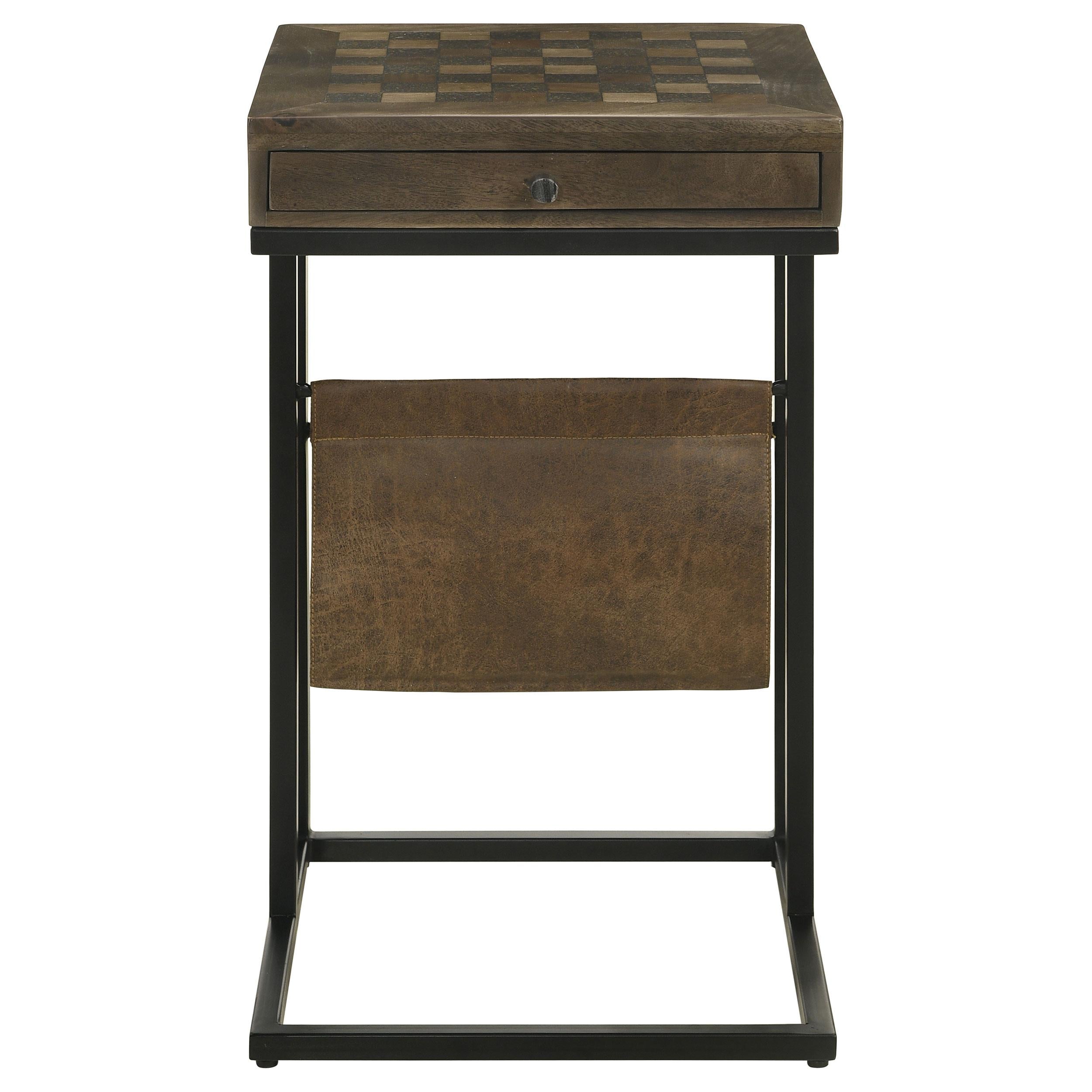 An iconic game with legendary roots folds into the design of this accent table, a perfect choice for adding function as well as entertainment to your living room or game room. Chess is the name of the game as this wood, iron, and leatherette table serves as a side piece with multi-functionality. A carved-in chess board graces the surface of the table’s rustic tobacco finished top unit, which includes a storage drawer to store included Terrazzo game pieces or incidentals. An iron frame offers a bold black finish and an openwork design, reflecting a casual yet tasteful design. Stash books and periodicals in a brown leatherette magazine holder mounted under the tabletop and turn this side table into a multi-purpose center for activity.