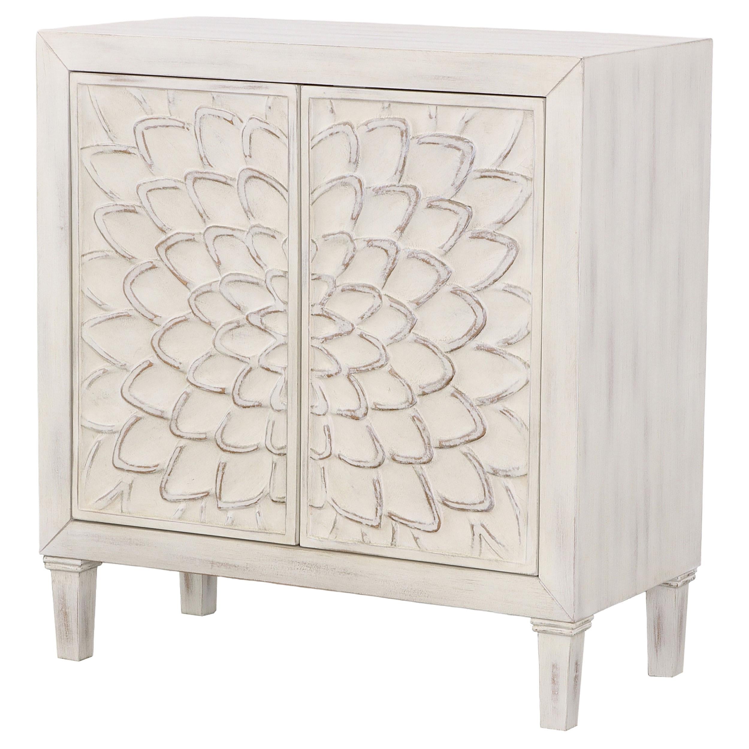 Bring charm and character to your space with this beautifully crafted accent cabinet. Featuring intricately carved floral doors and a distressed white finish, this piece delivers a perfect blend of rustic farmhouse and timeless elegance. Inside, a spacious shelf keeps everyday items neatly tucked away while tapered legs add a classic touch.