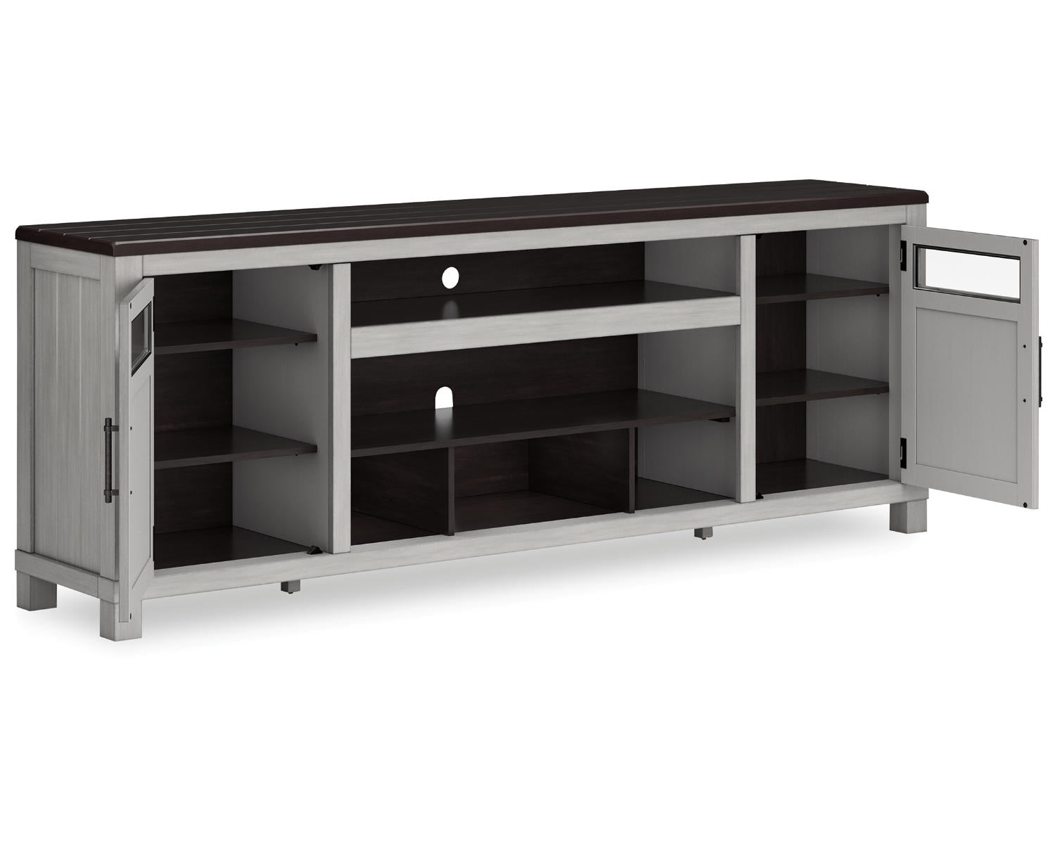 Make a farmhouse-inspired statement with this TV stand. It’s beautifully crafted to stand the test of time, with a planked effect and clean two-tone finish that lend a relaxing vintage feel. With two cabinets (each with an adjustable shelf) and an open cubby, it offers plenty of storage to house all of your electronic needs. Enhancing the experience: the optional fireplace insert (sold separately) brings a touch of warmth and beautiful ambiance to your living room.