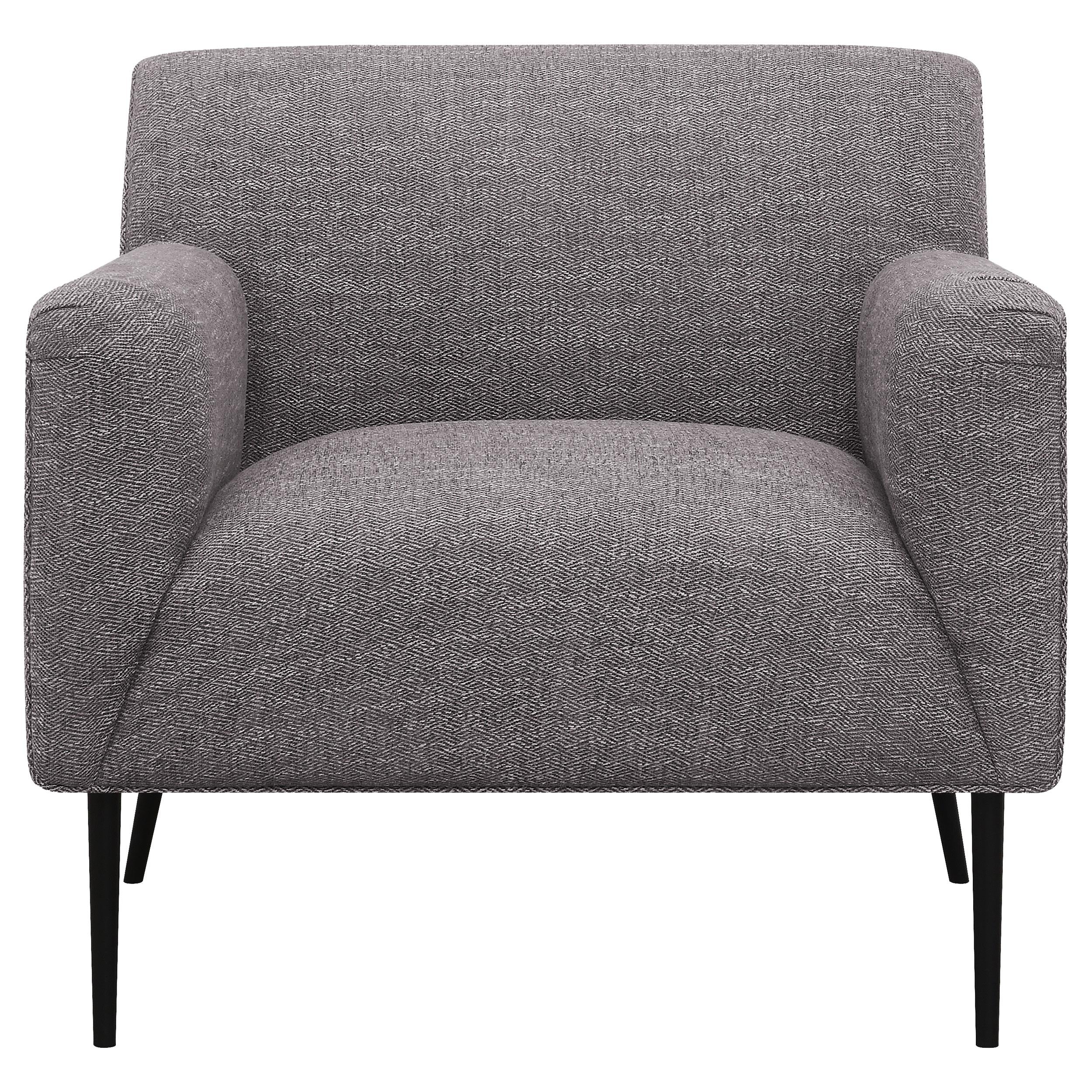 Present your transitional living room seating area with this sleek and sophisticated contemporary lounge chair, upholstered in a soft fabric throughout its rounded armrests, tight back, and elegant waterfall edge seat. Classic welt trim, pleated armrests, and slim tapered metal legs come together to add the finishing touches along with a mid-century modern expression.