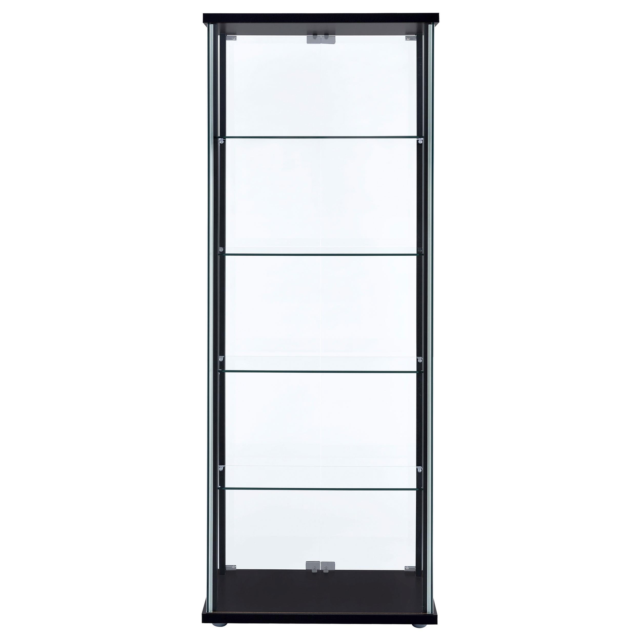 Transparency and linear styling make this curio cabinet stand out and shine. Simple design work blends straight lines with a slender black frame and tempered glass shelves. Push-to-open doors offer easy access to interior shelving. Put your best decor on display in this elegant piece that works beautifully in a living room or end wall. This enticing curio cabinet delivers a breathtaking look in modern and more traditional interiors.