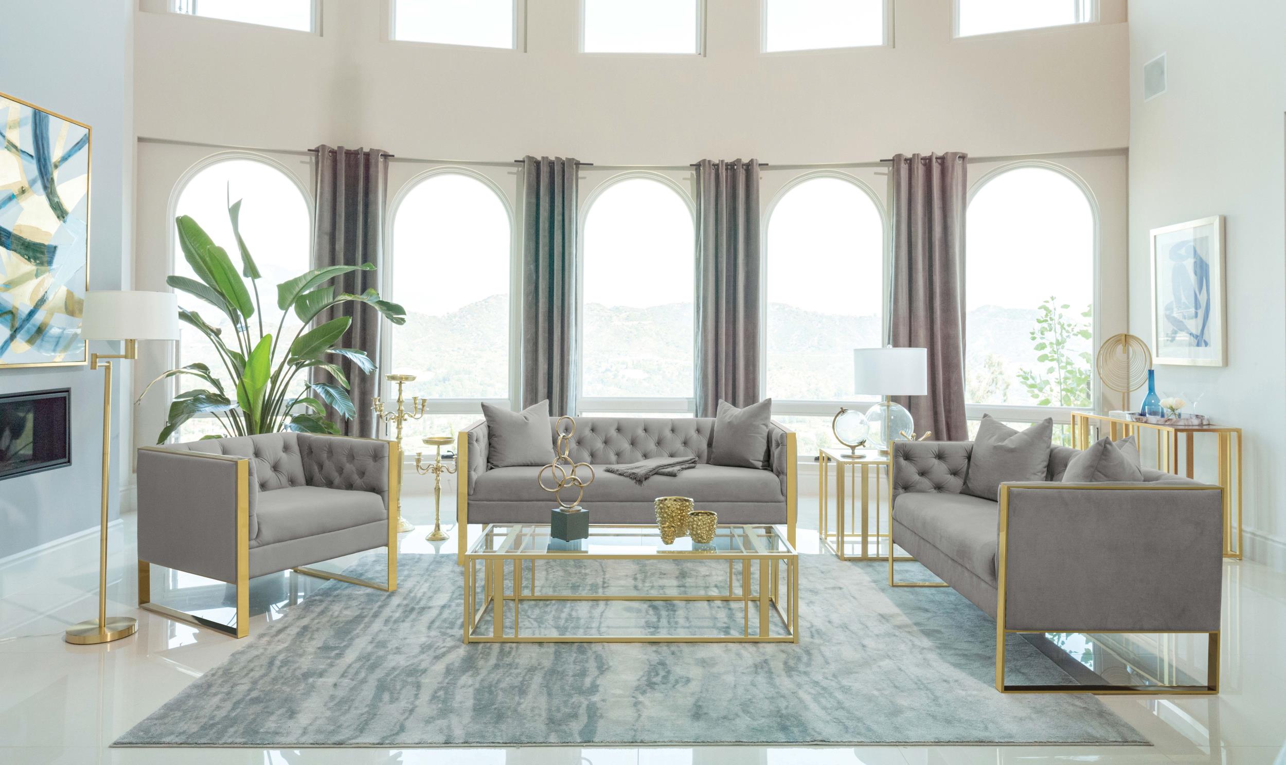 A blend of contrasting tones and materials will make this modern two-tone accent chair a mainstay in your home. It's upholstered in button tufted soft velvet in an elegant light grey finish that matches most any decor. A gold stainless steel base wraps around the arms and forms sturdy U-shaped legs. It's a feast for all your senses as you sit back and enjoy this cozy chair after a hard day. It's designed to be as at home in a modern living room or den as it is in an eclectic home library or entertainment room.