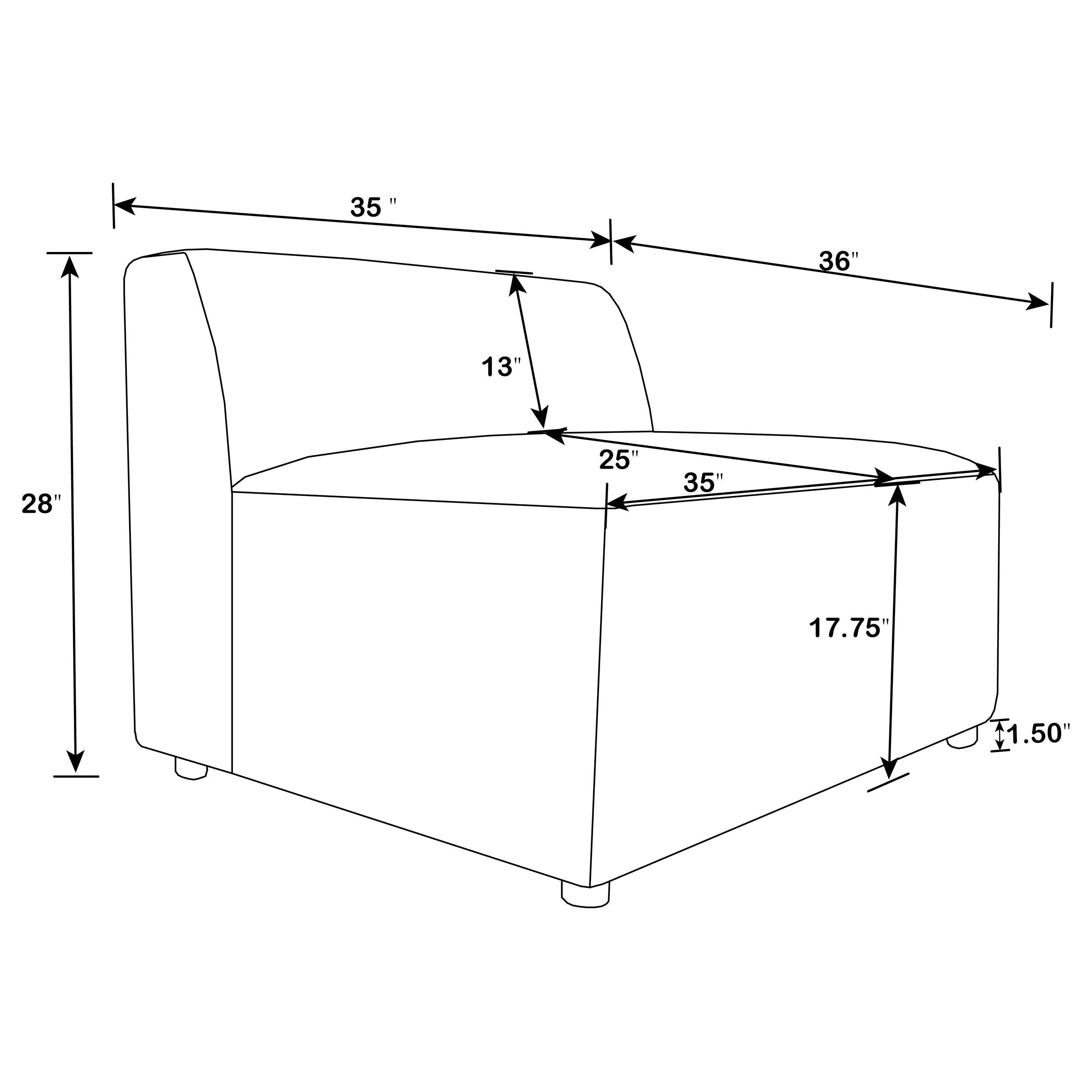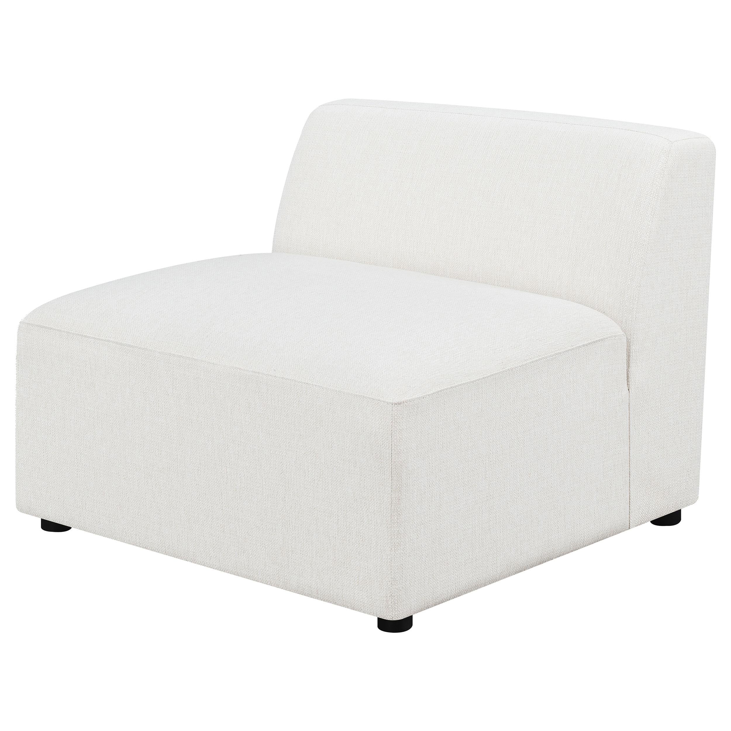 Create your ideal sectional configuration with this modern armless chair, upholstered in an easy-to-maintain pearl performance fabric across a foam padded pocket coil seat and low-profile attached back. A thick bottom seat rests on hidden black round legs, lending a hint of contrast and a clean, seamless silhouette.