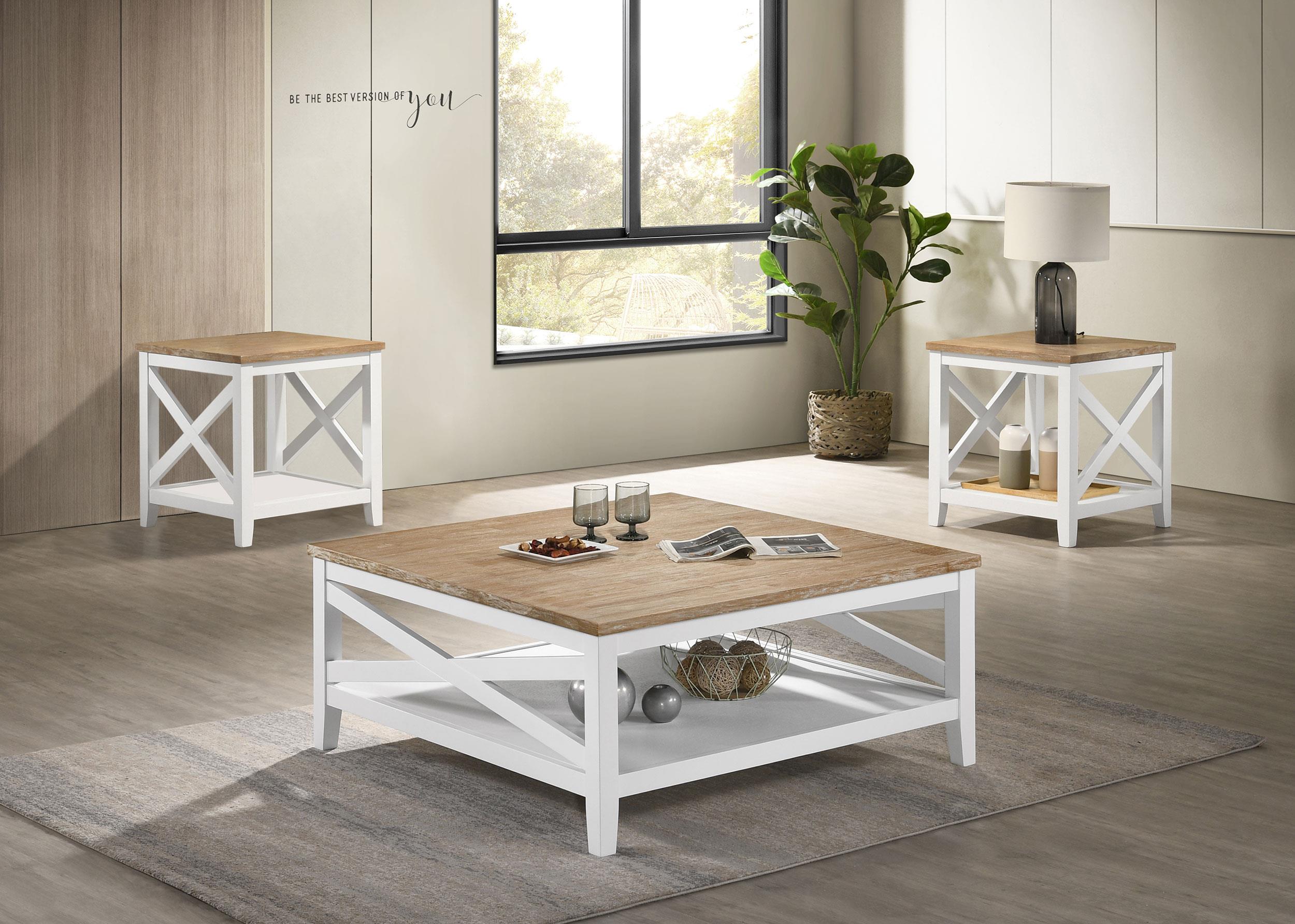 Elevate your living space with this farmhouse-inspired coffee table set, perfect for casual and cozy settings. The two-tone design features wire-brushed ash veneer tops in a warm brown finish paired with crisp white bases. Each piece showcases X-cross side accents that add charming detail, while open lower shelves offer ample space for storage or display. Built with durable engineered wood and Asian hardwood, this set is both stylish and practical, blending seamlessly into cottage and coastal decor.