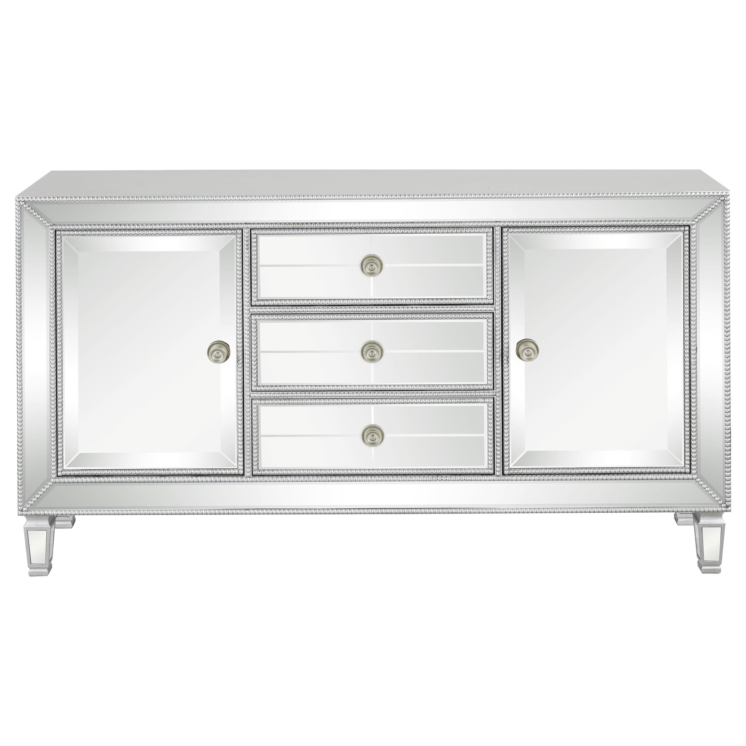 Make a glamorous statement with this champagne-finished accent cabinet, featuring dazzling mirrored panels and elegant beaded trim. Designed with three center drawers and two side doors, it offers ample concealed storage without sacrificing style. Tapered mirrored legs and round crystal-style knobs enhance its luxe appeal, making it a radiant addition to any entryway, dining room, or living area.